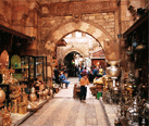which established Cairo as a major center of trade, and at the Khan, one will still find foreign merchants. Perhaps, this vary market was involved in the spice monopoly controlled by the Mamluks, which encouraged the Europeans to search for new routes to the East and led Columbus, indirectly, to discover the Americas.During its early period, the market was also a center for subversive groups, often subject to raids before the Sultan Ghawri rebuilt much of the area in the early 16th century. Regardless, it was trade which caused Cairo's early wealth, even from the time of the Babylon fort which was often a settlement of traders. This market is situated at one corner of a triangle of markets that go south to Bab Zuwayla and west to Azbakiyyah. The Khan is bordered on the south by al-Azhar Street and on the west by the Muski Market. One of the old original gates guards the entrance to the original courtyard which lies midway down Sikkit al-Badistan (street). On a narrow street leading off al-Badistand, one will find the El-Fishawi Cafe, or Cafe of Mirrors, which was once a meeting place for local artists, and is still frequented by the Nobel Award winning Naguib Mahfouz, one of Egypt's most well known authors. There are any number of canvas covered streets such as the one pictured to the right. |