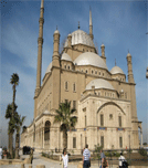 The mosque is the Tomb of Mohammad Ali and is also known as the alabaster Mosque because of the extensive use of this fine material from Beni Suef. Its two slender 270 foot minarets are unusual for Cairo. From the arcaded courtyard, visitors have a magnificent view across the city to the Pyramids in Giza. Just off the courtyard is the vast prayer hall with an Ottoman style dome which is 170 feet above. The parapet to the southwest offers a good view of the Sultan Hassan and Ibn Tulun Mosques and of Cairo itself. Perhaps because of its location, it is one of the most frequented Mosques by tourists. |