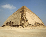 The Red Pyramid is thought to be older and is the only one that can be entered at this time. The Bent Pyramid was built out of limestone which was quarried locally. The casing was of polished Turah limestone. This pyramid is also known as the Southern Shining Pyramid. The casing blocks are very stable and very difficult to remove because they slope inwards. The base of the pyramid is 188.6m and is 105m high. Because of the bend in construction, the original angle would have made it 128.5m high.